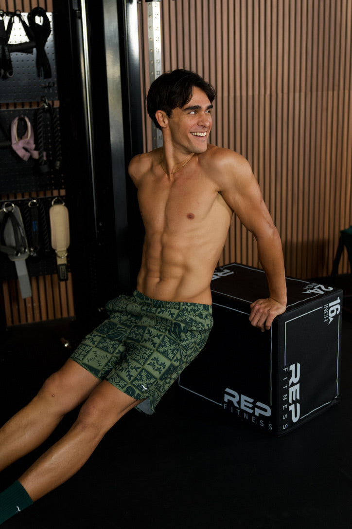 Our first-ever Men's 17" Athletic Short in our custom GREEN KUIKI print.