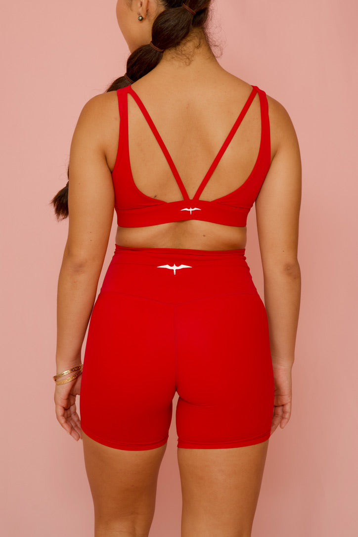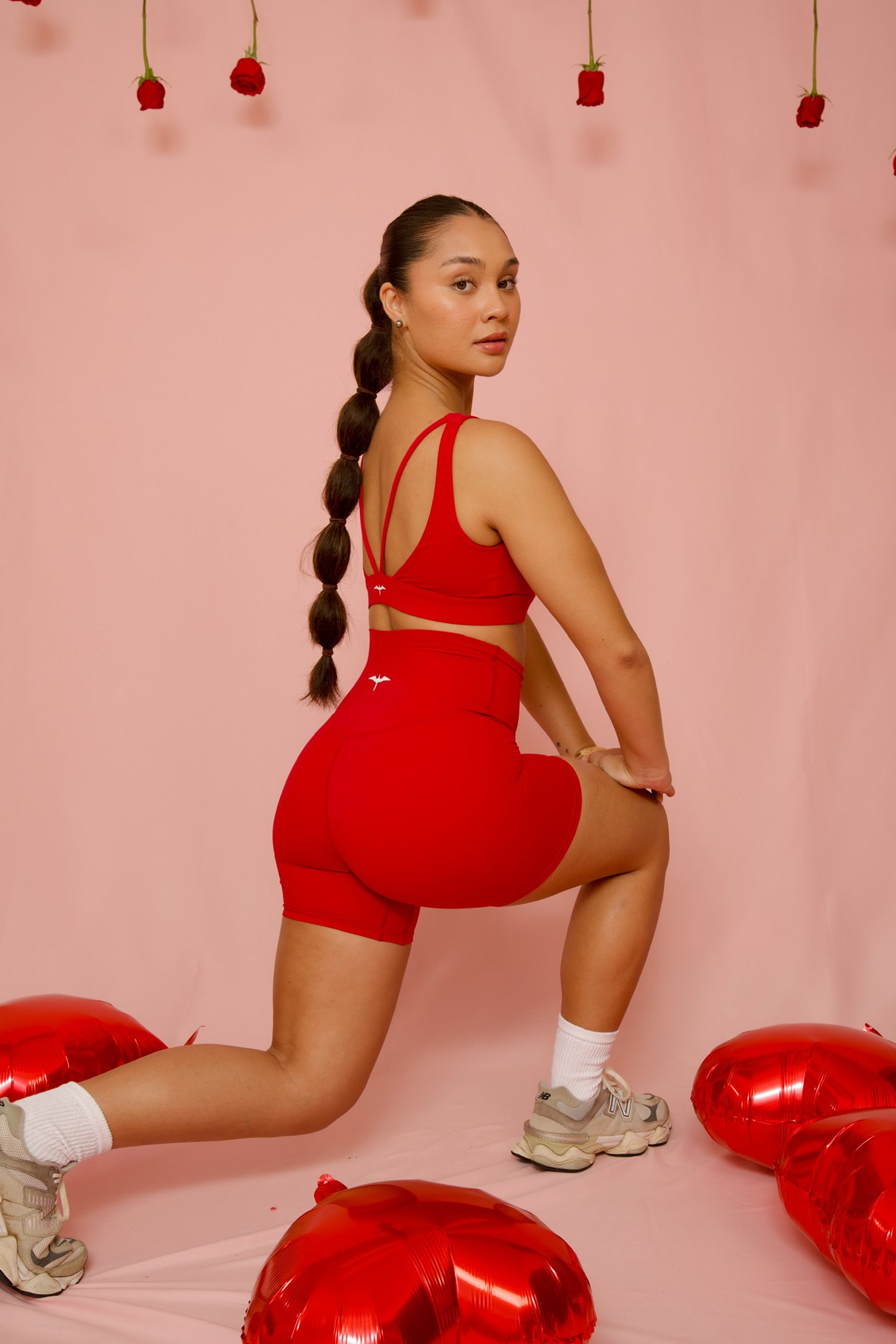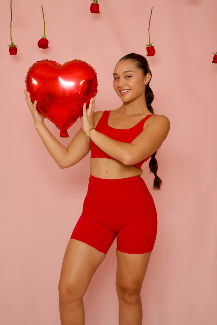 The "Kaikini" (kai-key-knee) Shorts in the color HEARTTHROB RED. Our heartthrob color is a bright, vibrant red.