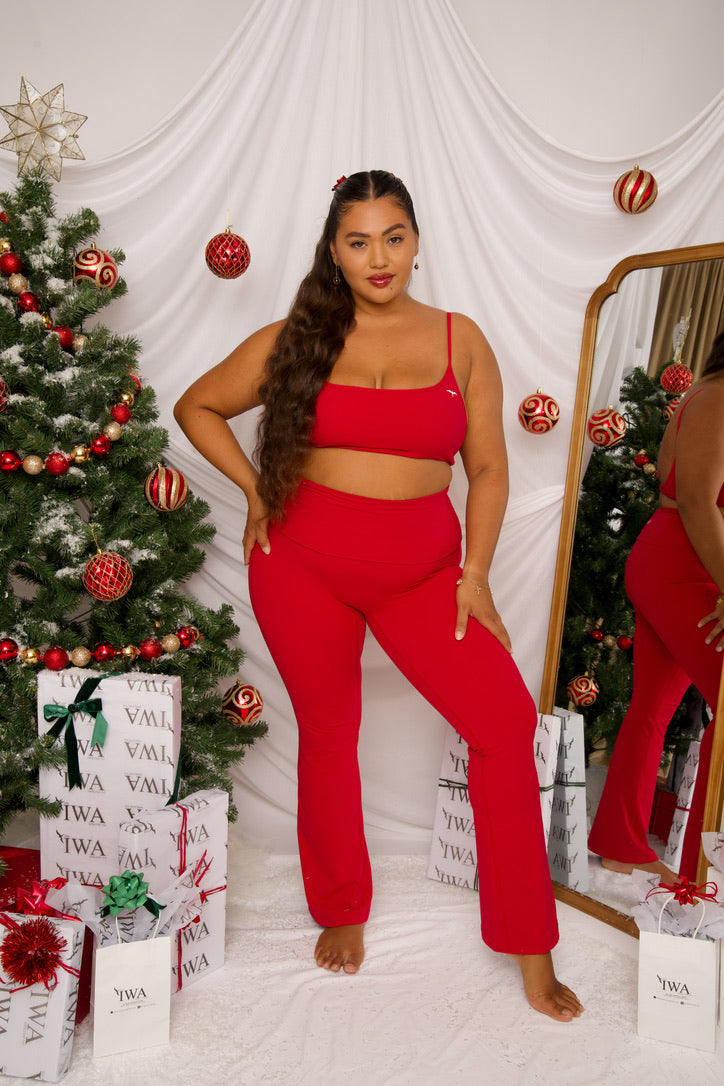 The “Kaila” (ky-luh)31" foldover bootcut legging in the color PEPPERMINT RED. Our Peppermint red color is a medium, christmas red.