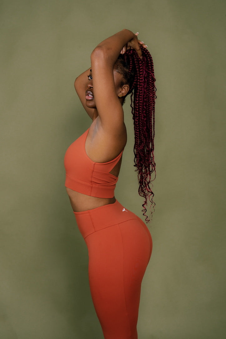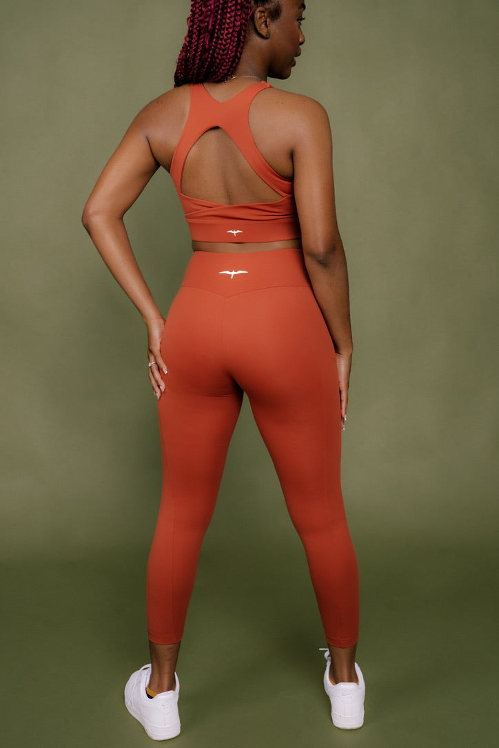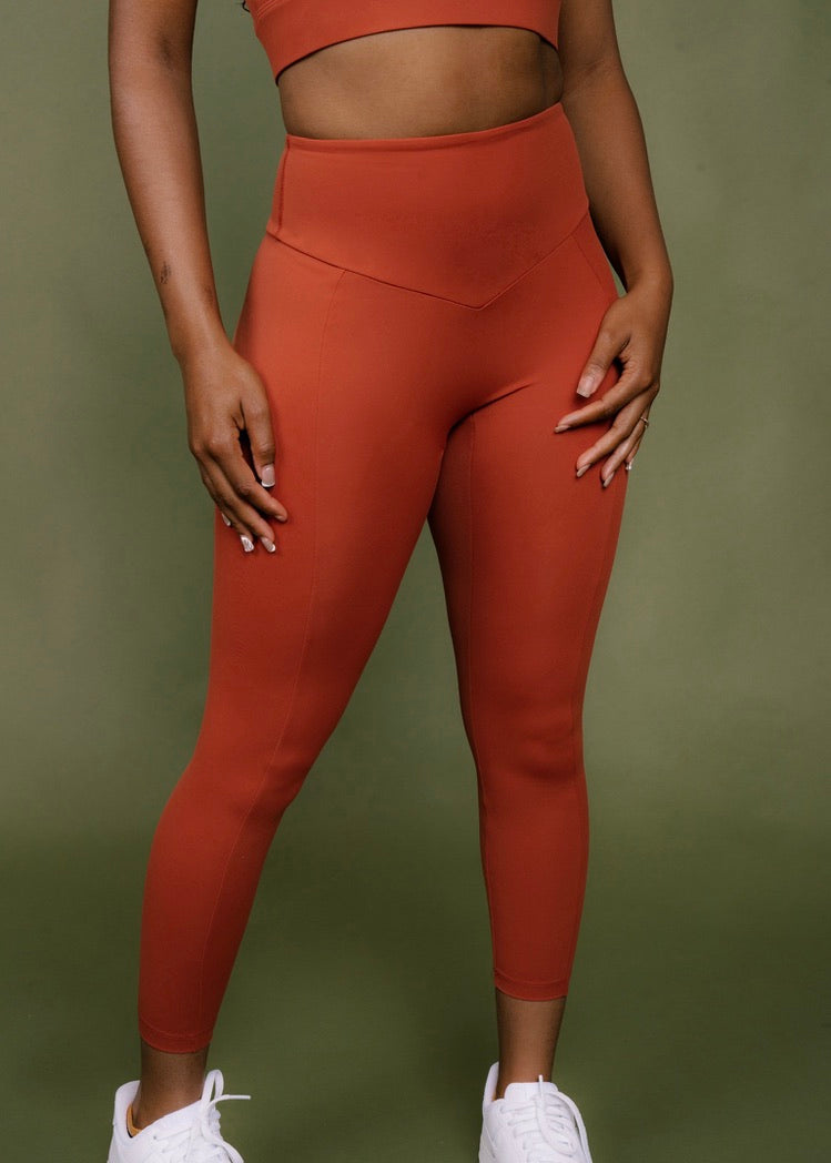 The "Kamakai" (cuh-muh-ky) 7/8 Leggings in RED DIRT. Our Red Dirt Color is a teracotta orange/red with a touch of brown.