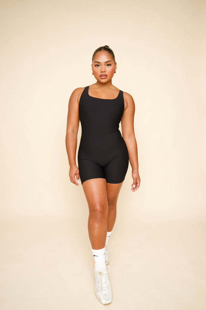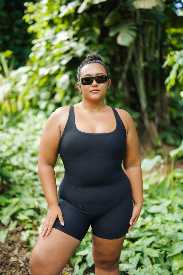 The KINO sculpt ribbed jumpsuit in the color ʻIWA BLACK. Our ʻIWA Black color is a classic midnight black.