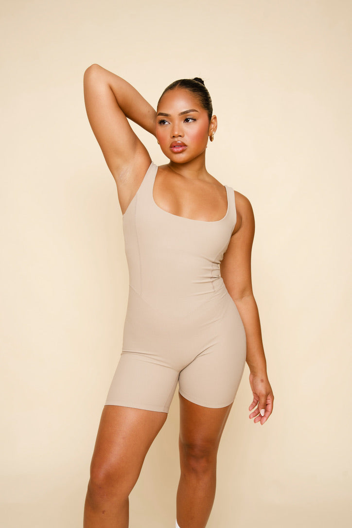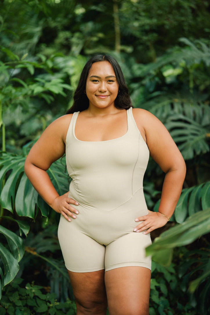 The KINO sculpt ribbed jumpsuit in the color KHAKI. Our khaki color is light brownish-tan color with cream undertones.