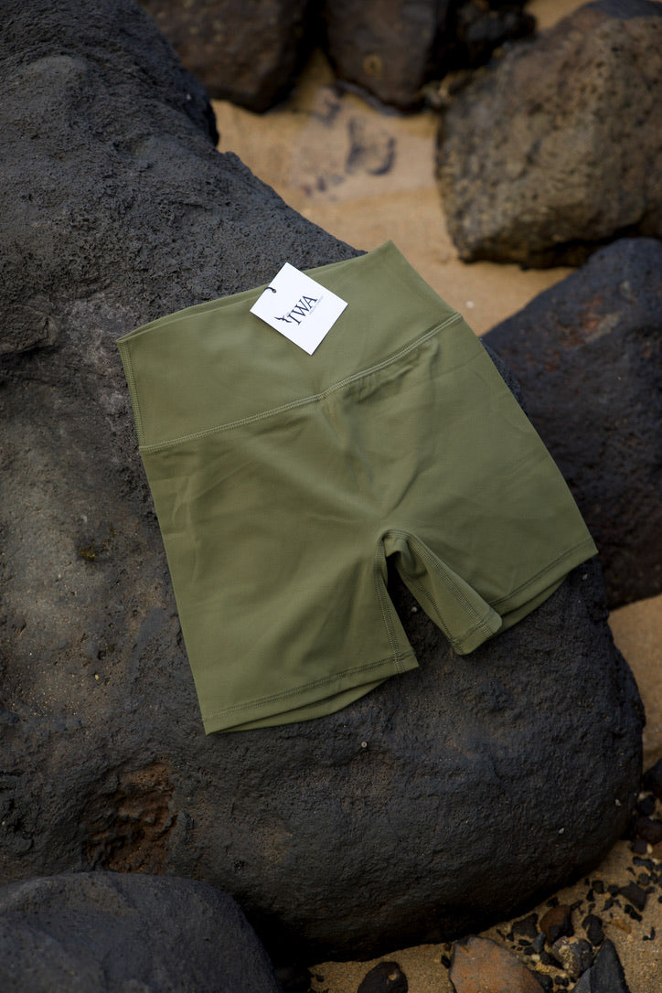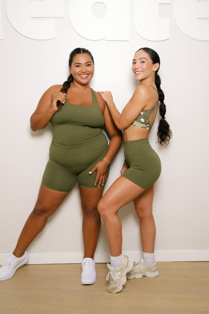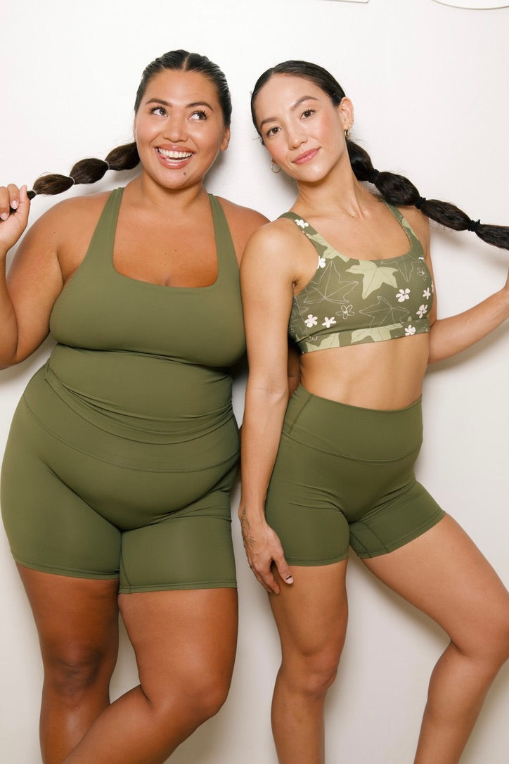 The "Kūkini" (coo-key-knee) crop top in GARDEN ISLE. Our garden isle color is a dark, olive green.