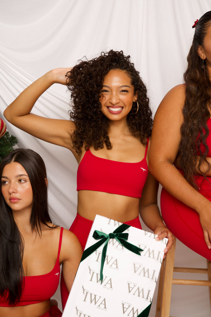 The “ʻOlina” (oh-lee-nuh) sports bra in the color PEPPERMINT RED. Our Peppermint red color is a medium, Christmas red.