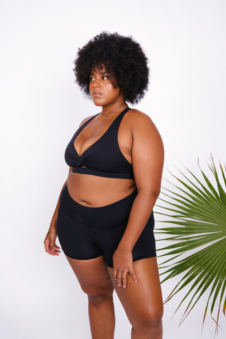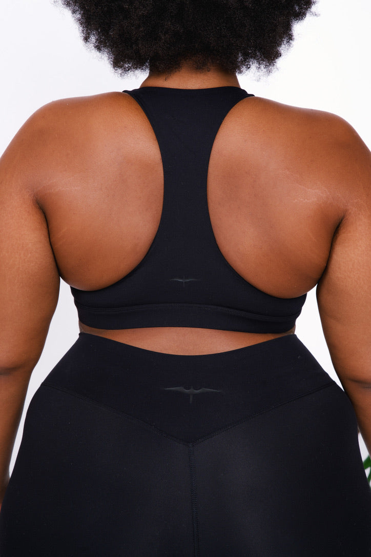 The "WILI" (vee-lee) sports bra in the color ʻIWA BLACK. This ʻIWA black restock is made with a limited edition matte black silicone heat transfer logo for a new sleek look.